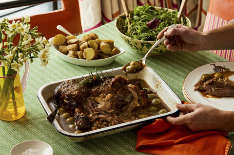 7. After 4 hours, test that the lamb is cooked by checking that the meat comes away easily from the bone. Once cooked, allow it to rest for 15 minutes before serving.